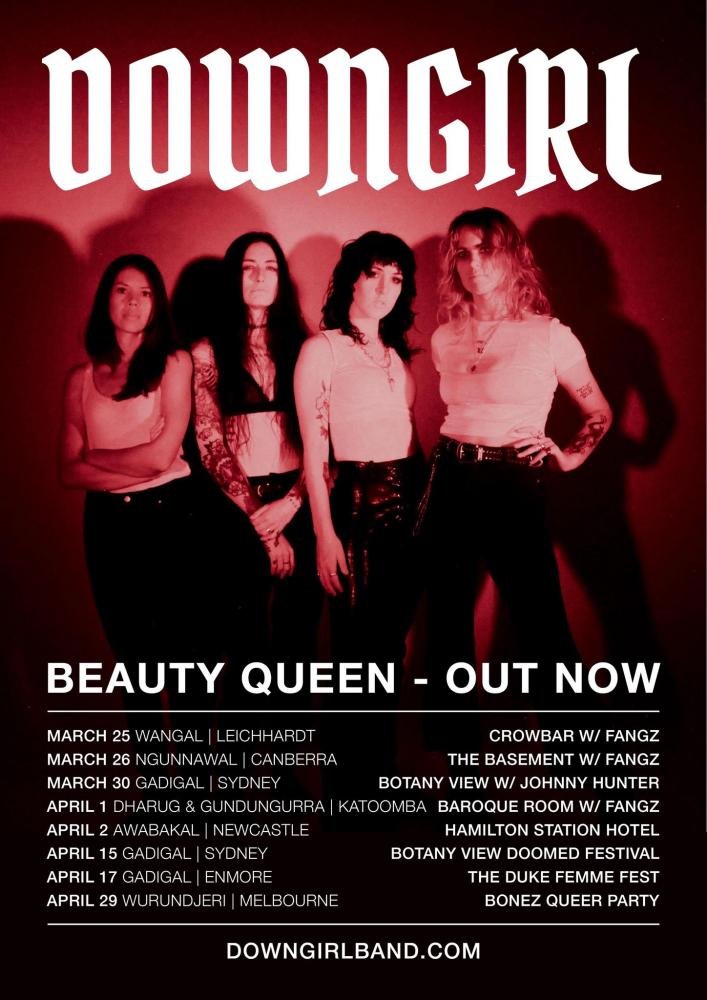 So we used to be in a band called BOYSCLUB, and as time went by, Ava [Noir], the guitarist, first left, and we tried to rebuild the band after that, and then Sera [Doll], the singer, ended up leaving during the second lockdown, just before the second lockdown of COVID in Sydney, and we just went, “Nope.” Half the band had gone from what it was, and we always made a pact – you know, if two people leave … It’s always been a democracy … So we just went, “Alright, that’s it, rest in peace. Let’s start DOWNGIRL.” So Kristen [Adams], Lou [Harbidge] and I just started writing, and we started pumping out these demos online towards each other on GarageBand … They didn’t sound great at all, but it was just so cathartic, because we couldn’t leave the house. We couldn’t do anything for six months, so we wrote over twenty songs, all different … All of us wrote. Every single song that you’re probably going to hear was written by a separate one of us, and we all bought it online during COVID, so it kind of stemmed from BOYSCLUB. We were still looking for a singer, and then we remembered Alex [Neville], and Alex is really good friends with Kristen … We just started sending riffs over, and Alex sent the riff for Beauty Queen – the first thing she ever sent us online. I just went, “Oh fuck, that’s badass,” so I just went on GarageBand and programmed shitty drums to it, and then she sent it back with vocals, and we sent it to Lou, and Lou put bass [on it], and Lou sent it to Kristen and she did backup vocals and slayed some solos. [Laughs] And we just went, “Yeah, that’s a fucking single, hey?” That was the first song, and we’ve got, like, twenty others that we’ve written from there too.