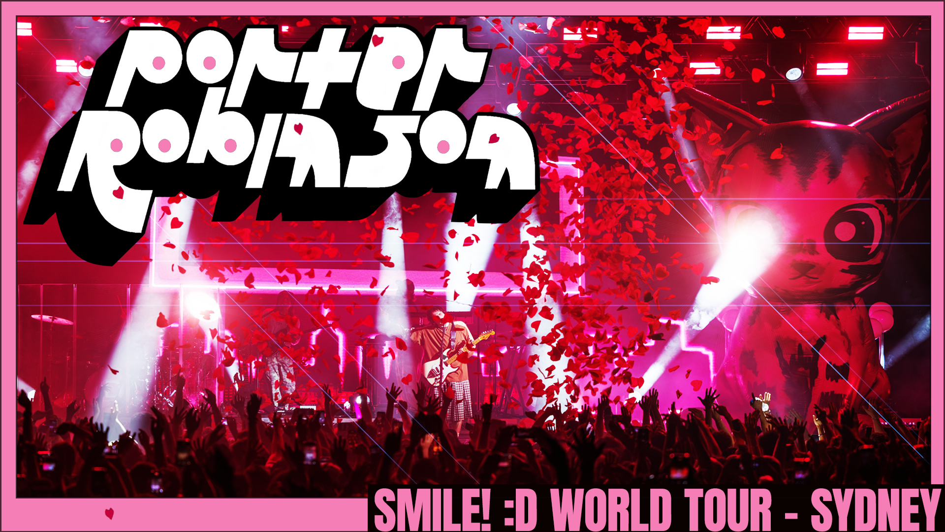 An electronic buzz filled the Hordern as red lights flicker across the stage, four musicians run across to their instruments, ‘SMILE :D’ Intro begins as Porter skips out on stage with the crowd chanting “bump dum dada dum da da dah dum” to the catchy ‘Knock Yourself Out’ tune. “One two three let’s go” calls out Porter. The crowd have erupted in cheers, screams, and they don’t miss a beat to sing along. Porter’s presence is energetic, capturing the crowds hearts and excitement as he leans in to engage. His vocals are beautiful and crystal clear. He calls out “Sydney how are you?” another roar from the crowd as he seamlessly talks between singing. The audience know every lyric. The atmosphere is already amazing. Porter counts down “four three two one”, before cannons blast pink and white confetti into the crowd. The LED at the back has a running of -SMILE! :D- across it and selected lyrics. Porter’s songs are designed for others to enjoy and sing along. He grabs his custom designed ‘split apple’ Fender Stratocaster for ‘Perfect Pinterest Garden’ and slings it over onto his back. The panel lights up with a city scape, and the lyrics display on the LED. Onto ‘Kitsune Maison’ he uses his C.K Martin & Co acoustic guitar. This is a song about materialism and adapting for acceptance, where he jokes about and says all the things he tried but nothing helped, except maybe his Brazilian butt lift, ending the song with “just trying to look good got a BBL, trying to look good not to feel bad”.