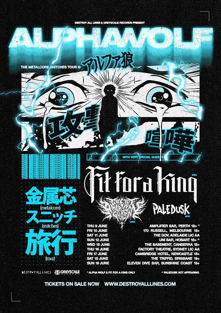 That's right, ALPHA WOLF, Australia's finest metalcore juggernauts will be embarking on their biggest national headline tour around the country for The Metalcore Snitches tour joined by their close friends in FIT FOR A KING (USA), GREAT AMERICAN GHOST (USA) and PALEDUSK (JPN).